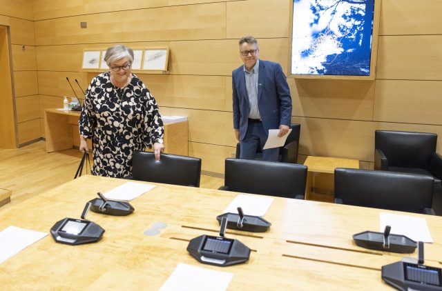 Ulkoasiainvaliokunnan kokous on alkamassa 6. toukokuuta 2022. Kuvassa Anu Vehviläinen ja Peter Östman. (Kuva: Hanne Salonen/eduskunta)