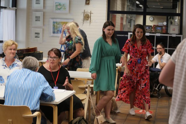 Satakunnan KD järjesti paljon yleisöä keränneen tapahtuman SuomiAreenan aikaan Porissa. Paikalla oli myös monia Kristillisdemokraattien varapuheenjohtajaehdokkaita, jotka saivat puheenvuoron kirjaston kahvilassa pidetyssä tilaisuudessa. Tiina Ahva kuvassa keskellä vihreässä mekossa, oikealla puolellaan Katriina Hiippavuori ja vasemmalla istumassa Tiina Tuomela. (Kuva Kristiina Kunnas)