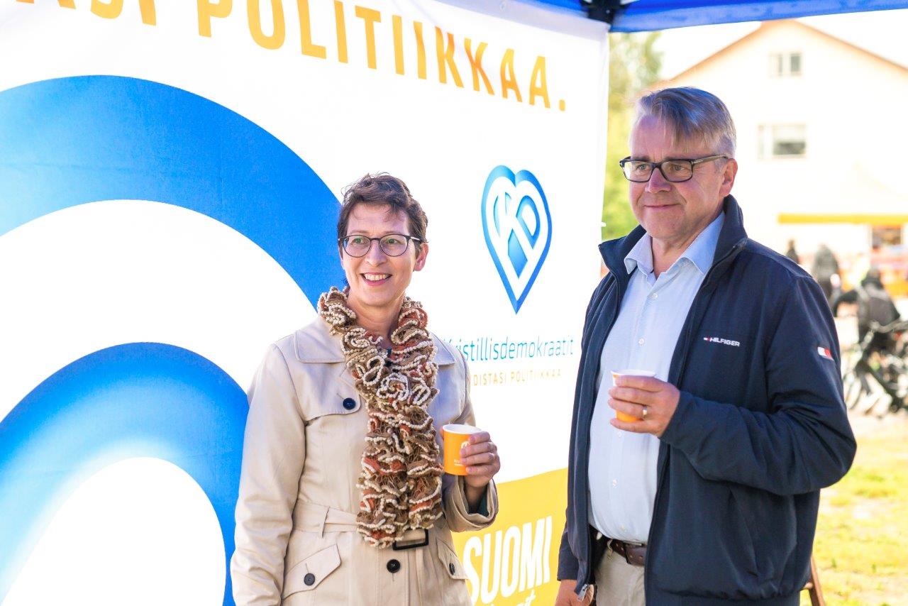 Kristillisdemokraattien puheenjohtaja Sari Essayah sekä varapuheenjohtaja Peter Östman saivat väen liikkeelle KD-kojulle Ylivieskan Kauppojen yön basaarikadulla.
