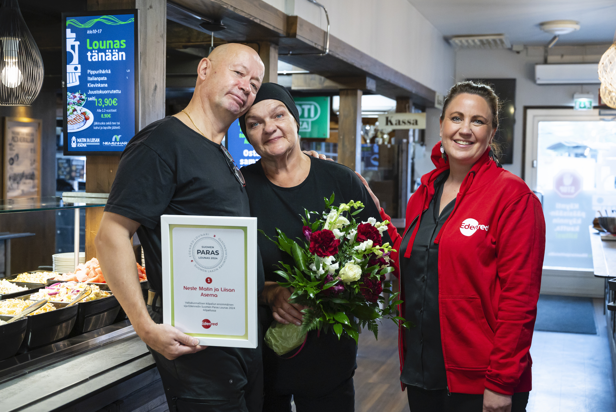 Edenredin kunniakirja saa arvoisensa paikan parhaaksi valitusssa lounaspaikassa. Jouni Majala on kiitollinen sinnikkäästä henkilökunnastaan. Raijalla on kädessään onnittelukukat.