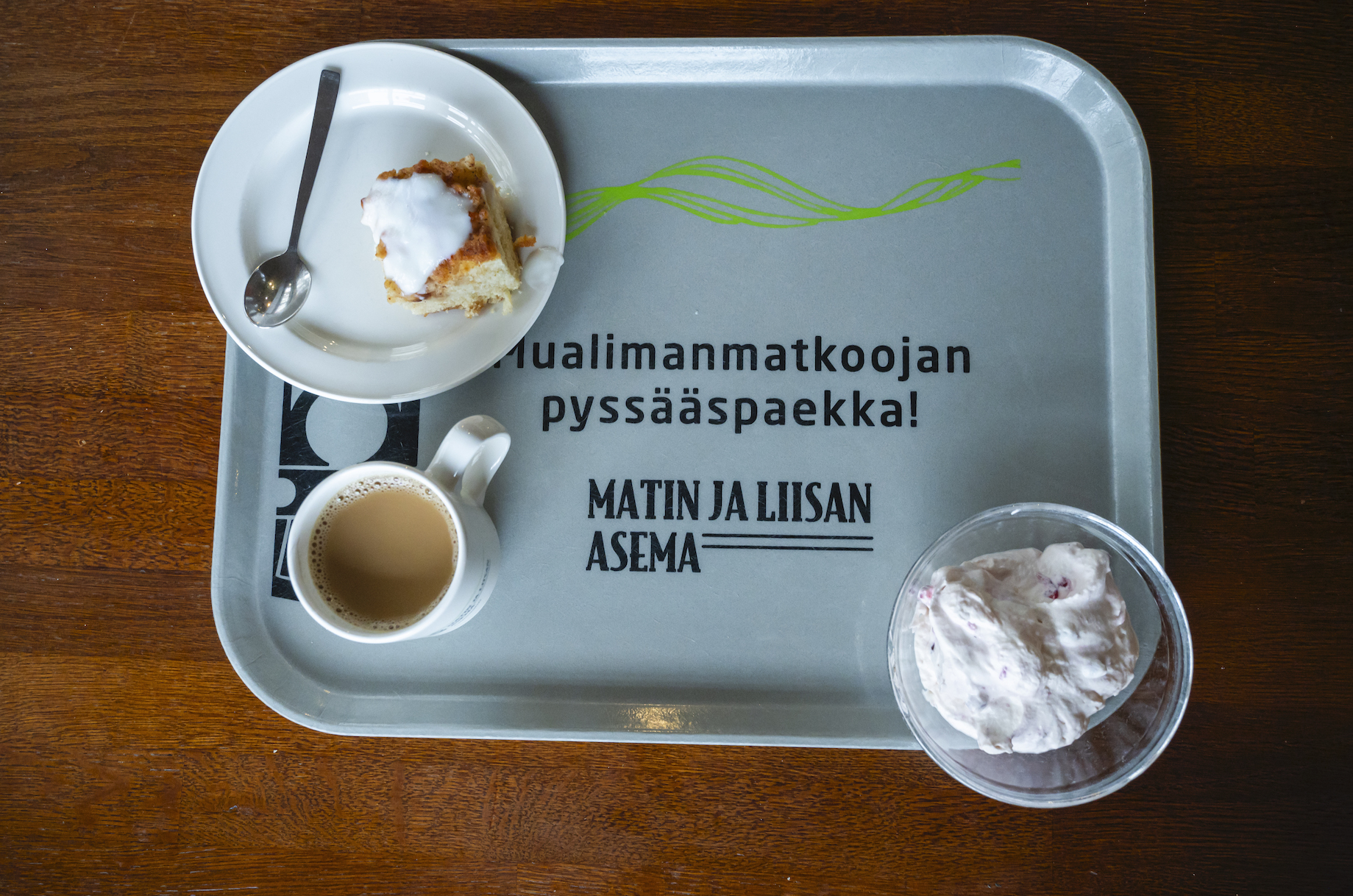 Kuvassa lounaan jälkiruoka ja Matin ja Liisan Aseman slogan Mualiman matkoojan pyssääspaekka. Matin ja Liisan Asemalla myydään noin 450 ruoka-annosta päivässä. Lounas on se vetonaula, joka houkuttelee päivittäin keskimäärin 300 ruokailijaa. Vitostien läheisyys tuo väkeä, joka koostuu matkailijoista ja työporukoista, lomailijoista sekä tietenkin oman kylän asukkaista.