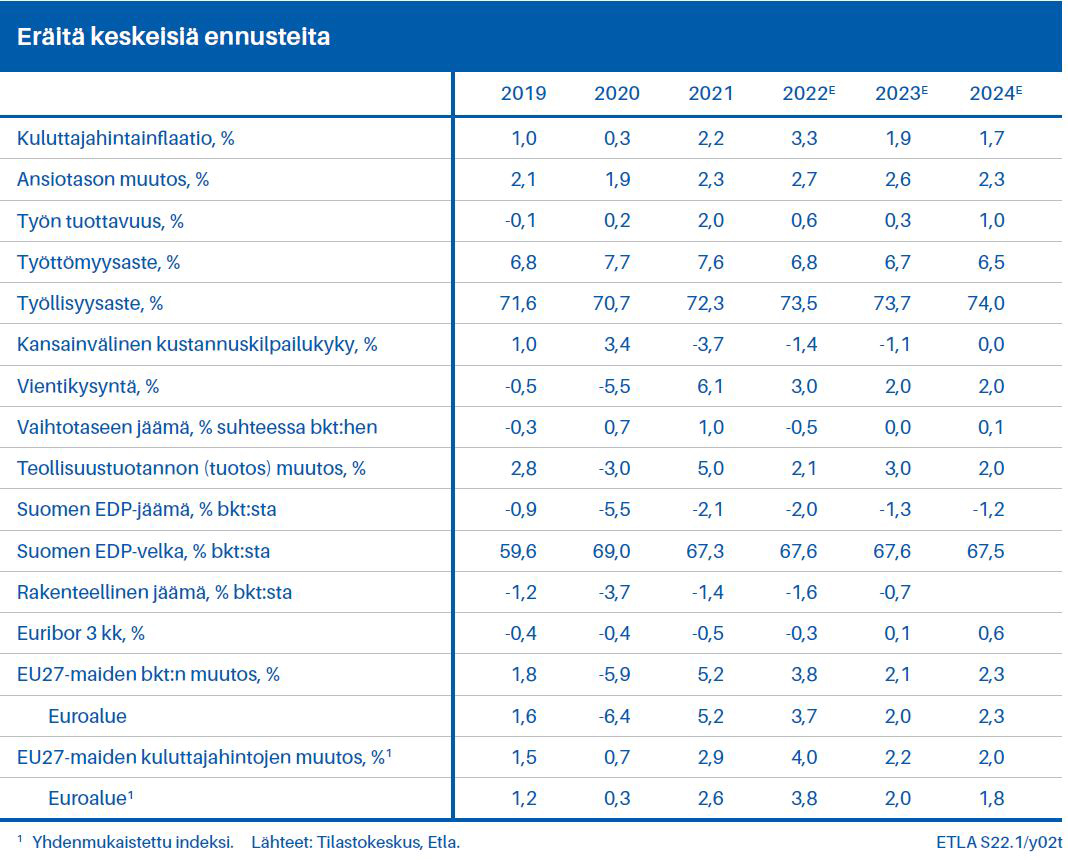 Suomen ensi vuoden talouskasvuksi Etla ennustaa yhtä prosenttia. Suurimmat riskit ennusteessa liittyvät uuteen turvallisuuspoliittiseen tilanteeseen. Riskejä ovat myös maailmankaupan logistiikan jatkuvat pullonkaulat, raaka-ainehintojen voimakas nousu ja mahdolliset uudet koronaviruksen muunnokset. Nettovienti vaikuttaa tänä vuonna Suomen kasvuun negatiivisesti.