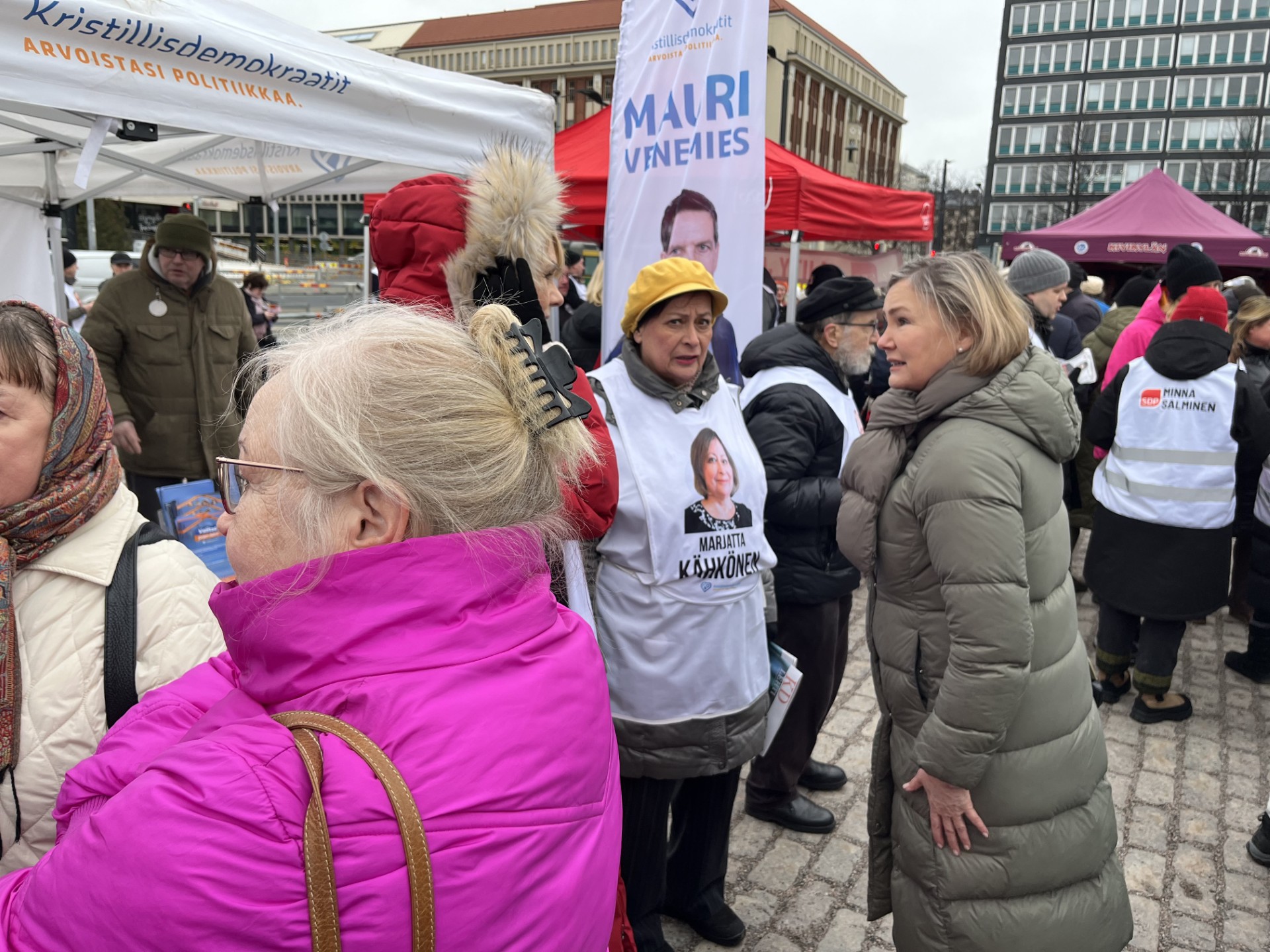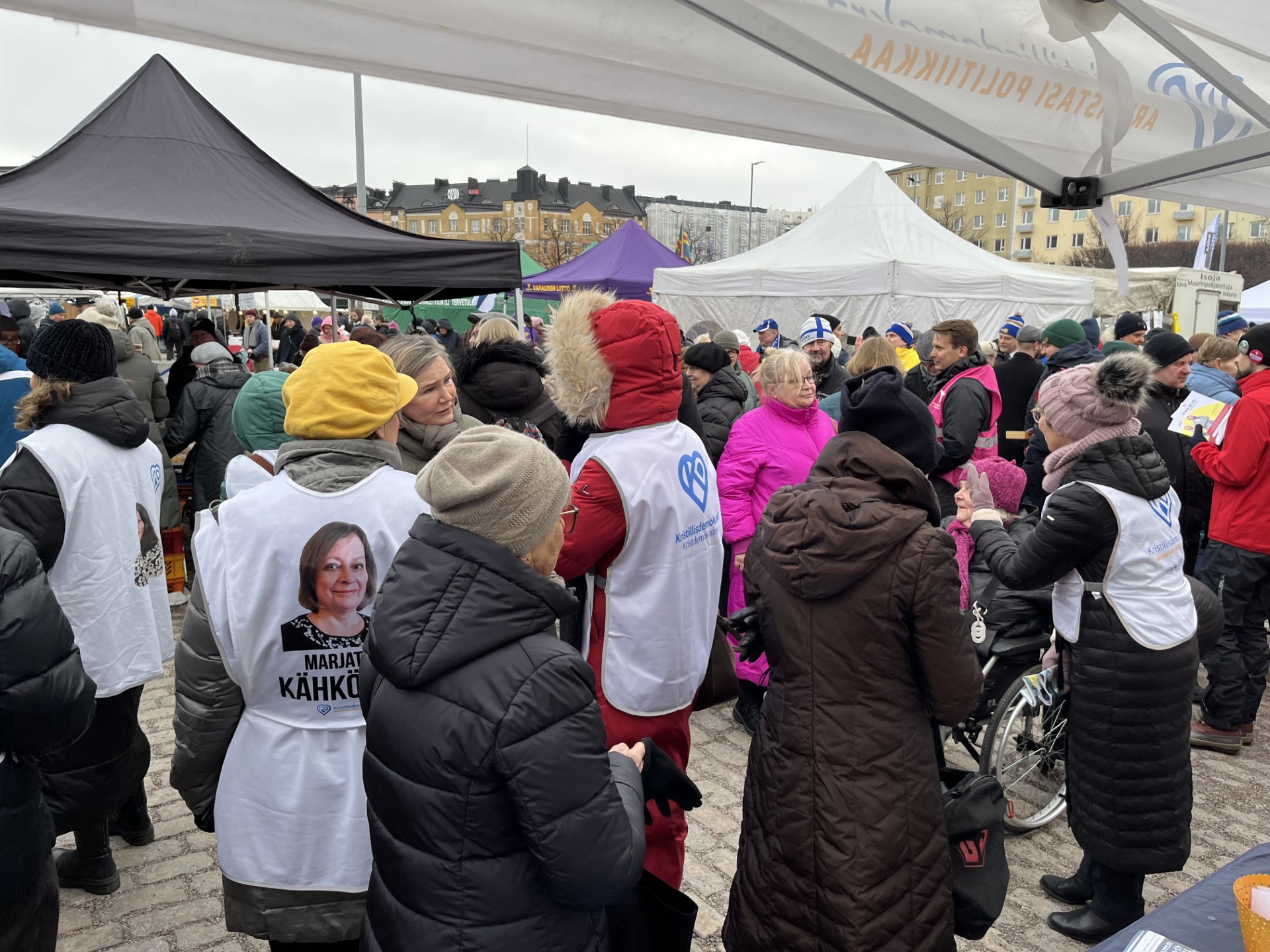 Äänestäjät ja ehdokkaat täyttivät Hakaniemen torin eteläisen päädyn niin, että läpikulku oli hidasta.