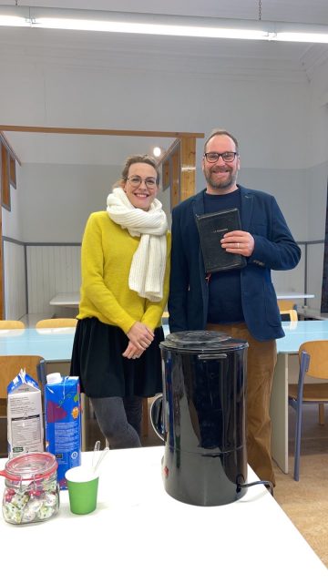 Katriina Hiippavuori toimii myös vankilalähettinä. Kuvassa hän on Aurassa Käyrän vankilassa niin ikään vankilalähetti Mika Hedmanin kanssa.