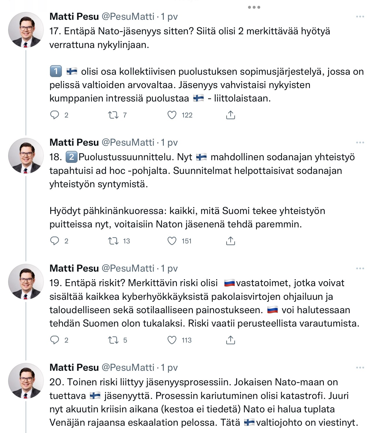 – Yhteistyön ytimessä on ollut pidäkkeen kasvattaminen ja edellytyksien luominen sotilaalliselle yhteistyölle myös sodan aikana. Liittoutumattomuudeksi Suomen politiikkaa ei voi enää kutsua, toteaa Suomen ulko-, puolustus- ja turvallisuuspolitiikkaan sekä euroatlanttiseen turvallisuuteen erikoistunut tutkija Matti Pesu Twitter-viestiketjussaan @PesuMatti 10. maaliskuuta.