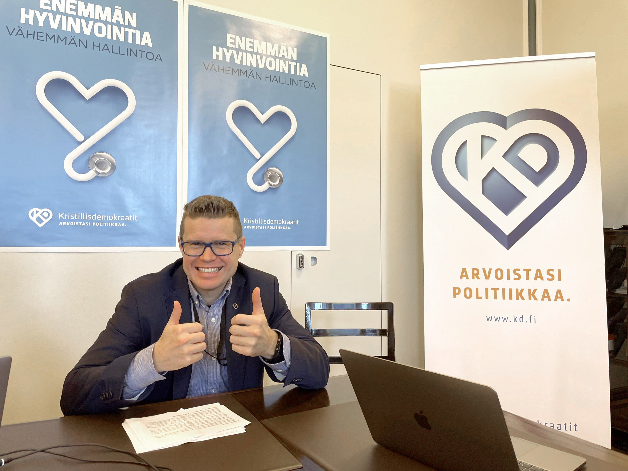 Vaali-ilmeen ja julisteiden suunnittelu on ollut puoluesihteerin työssä mieluista. Sydän-juliste Enemmän hyvinvointia vähemmän hallintoa on jäämässä 10 vuotta puoluesihteerinä toimineen Asmo Maanselän viimeiseksi ideoinniksi Kristillisdemokraateille, sillä hän siirtyy loppuvuodesta liike-elämän palvelukseen.