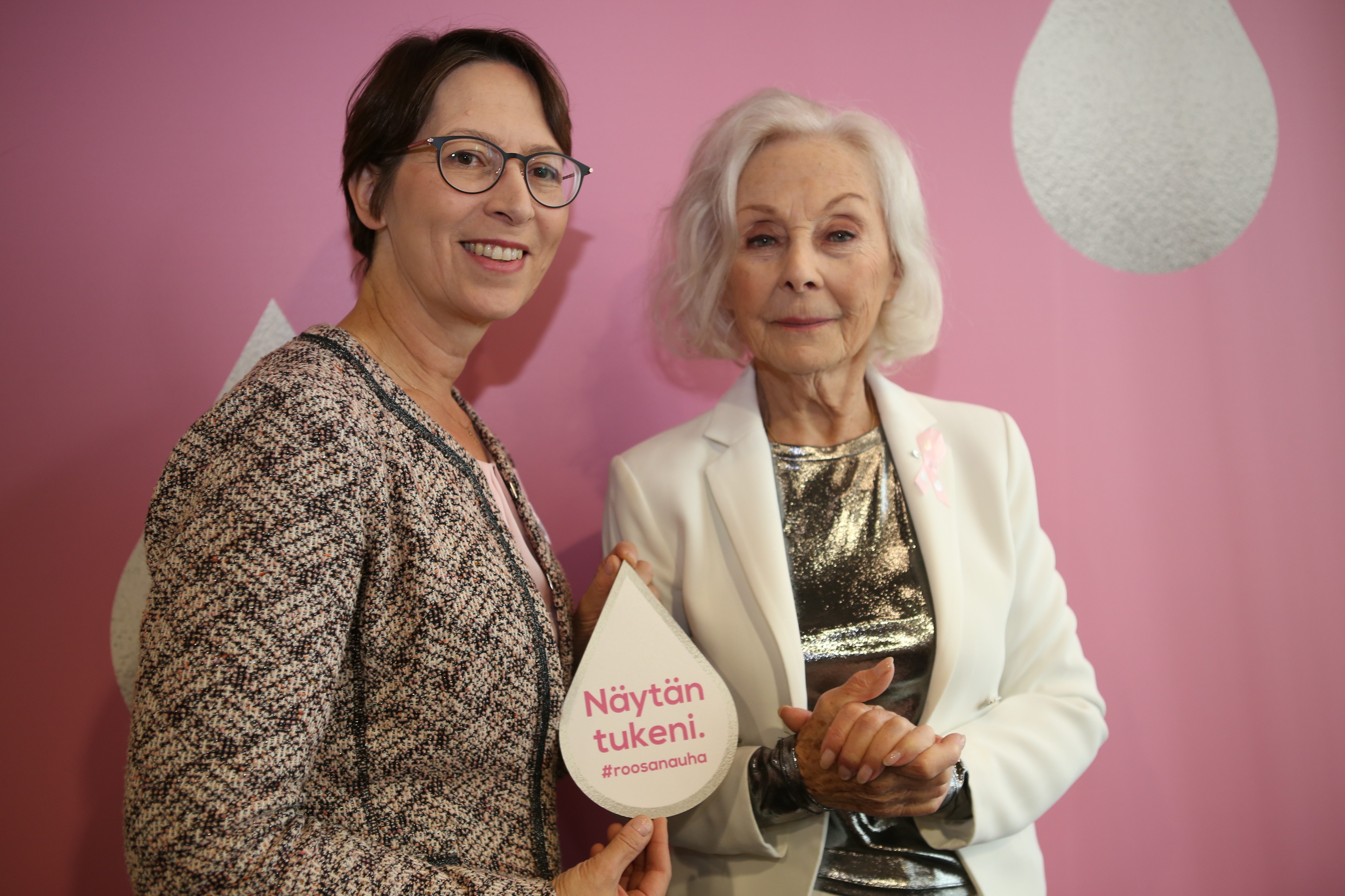 Kansanedustaja, puheenjohtaja Sari Essayah ja tämänvuotisen Roosa nauhan suunnittelija, näyttelijä Seela Sella Roosa nauha -keräyksen avajaisissa tiistaina 24. syyskuuta. (Kuva Kristiina Kunnas)