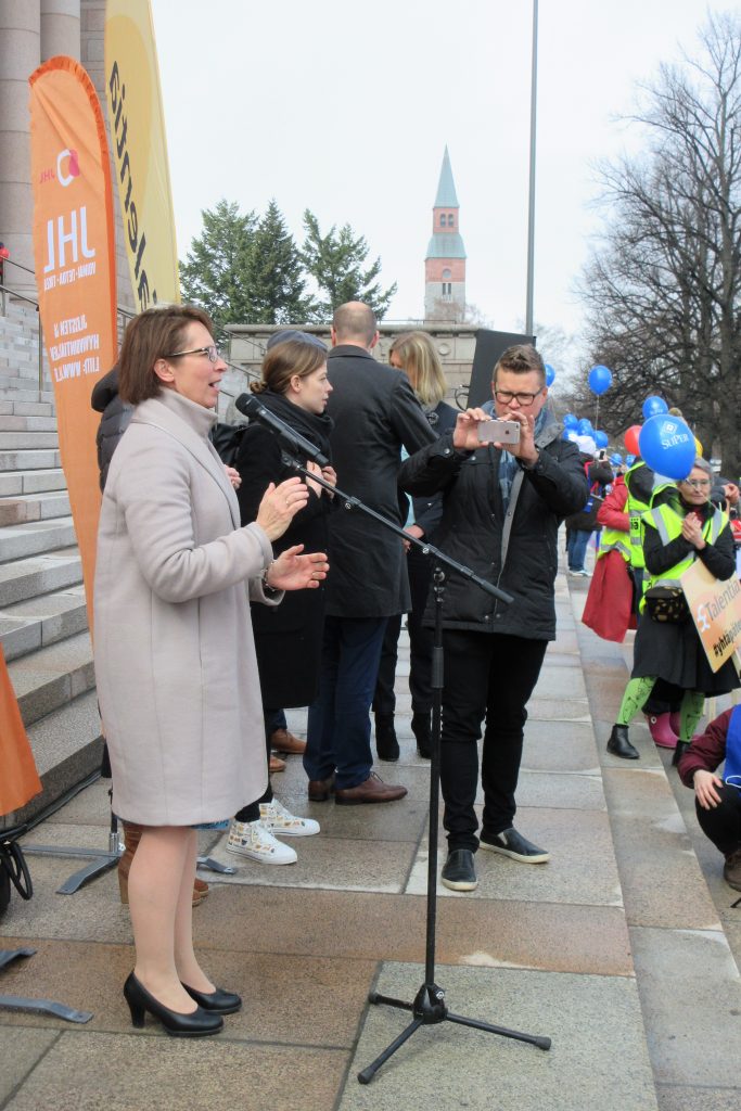 Kristillisdemokraattien puheenjohtaja, kansanedustaja Sari Essayah puhui mielenilmauksessa Eduskuntatalon portailla.