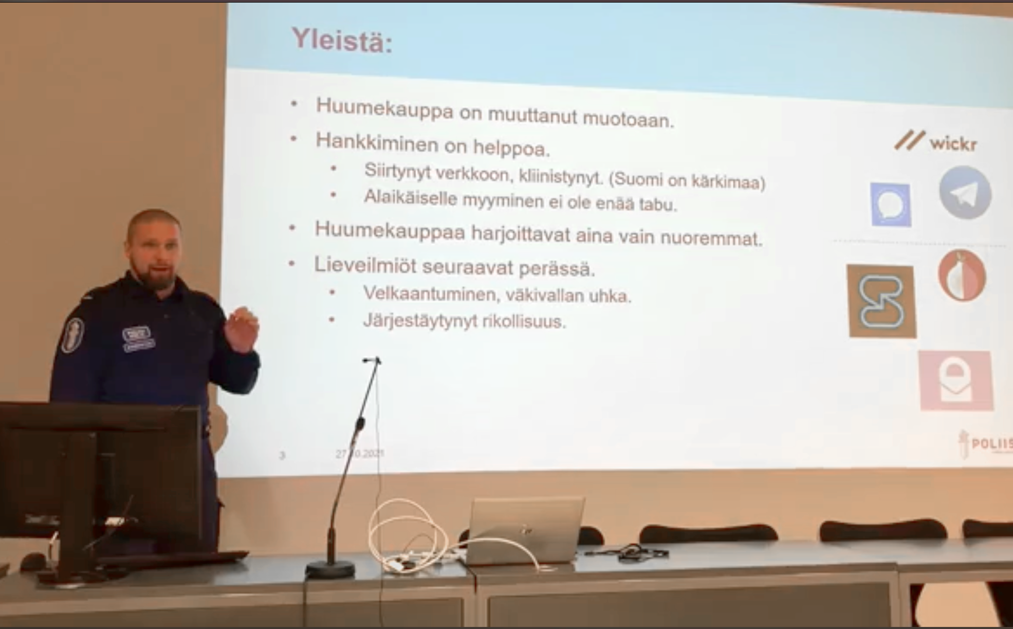 Vanhempi konstaapeli Jani Borenius kuvasi nuuska- ja huumekauppaa läntisellä Uudellamaalla HuumeetOn-tilaisuudessa Lohjalla 27.10. Kuvakaappaus tilaisuuden FB-streamauksesta.