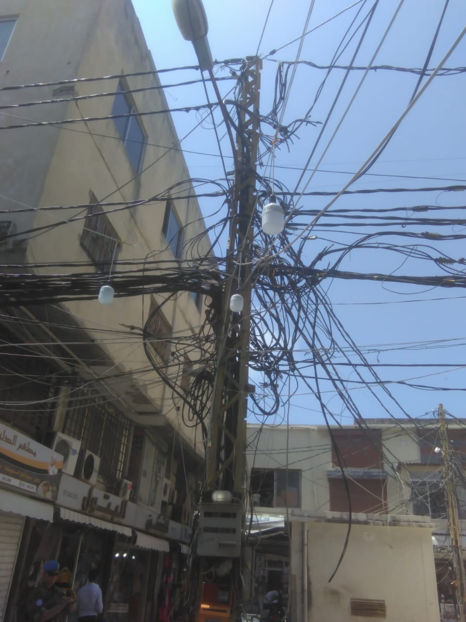 Lähi-idässä näkee monissa paikoissa katujen yläpuolella sekavia sähkölinjoja. Niistä ei saa selvää, mistä johdot tulevat ja mihin menevät. Ne ovat myös päällekkäin ja niin sekaisin, että niiden yhdistäminen näyttää mahdottomalta. (Kuva Teuvo V. Riikonen)