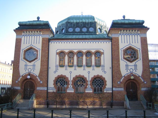 Malmön synagoga on rakennettu 1903. – Juutalaisyhteisö Ruotsissa joutuu nykyään satsaamaan enemmän ja enemmän turvallisuuteen. Etelä-Ruotsissa, kuten Malmössä, tilanne on hälyttävä. Israel-tapahtumissa esiintyessäni minullakin on turvamies, KD-meppi Lars Adaktusson kertoo. (Kuva Wikimedia Commons)