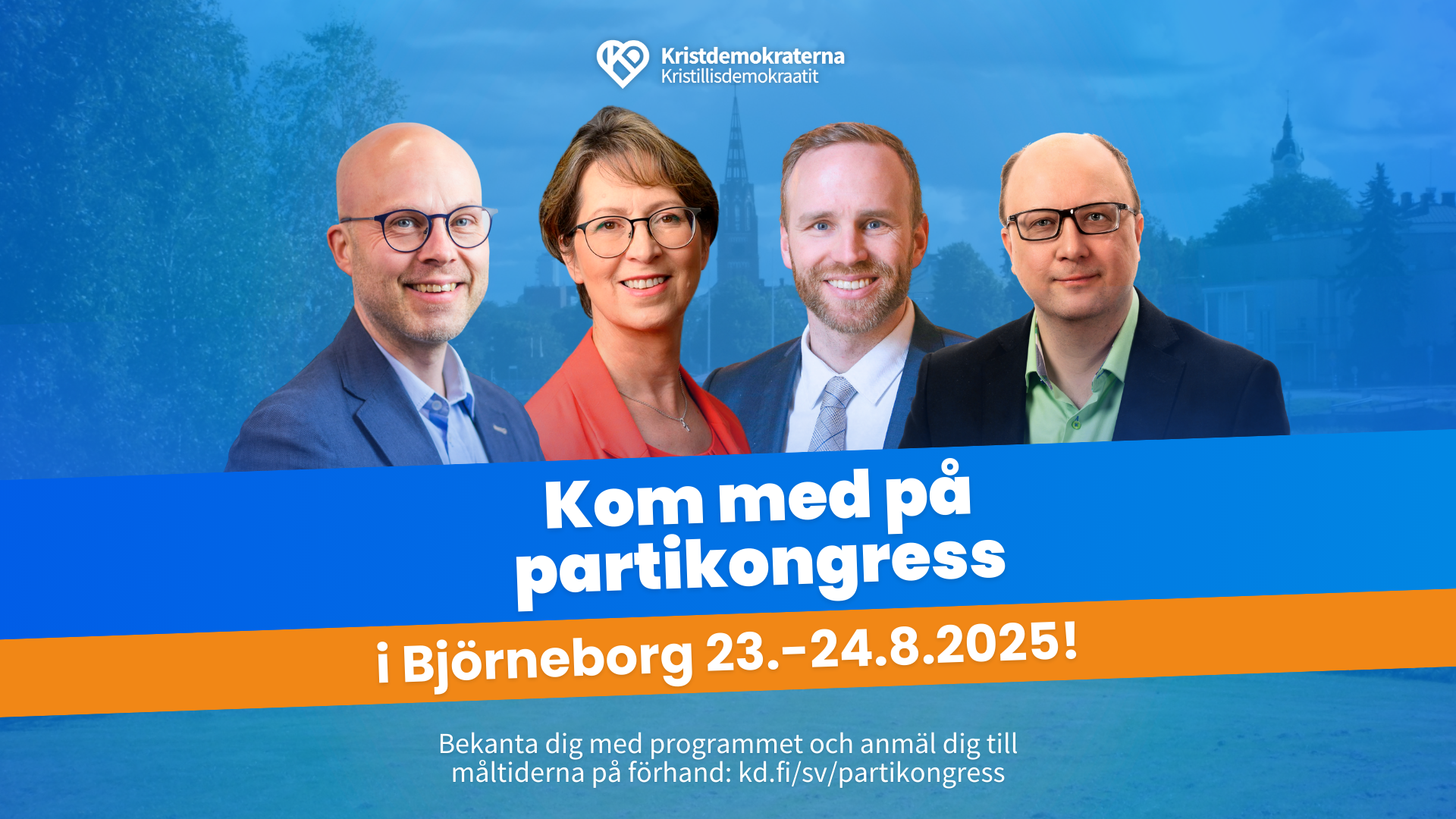 Kristdemokraternas nästa 36:e lagstadgade partikongress hålls som närvaromöte i Björneborgs gymnasium (Tasavallankatu 4) lö-sö 23.-24.8.2025. Tidtabell och program: www.kd.fi/sv/partikongress.
